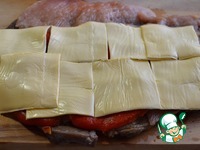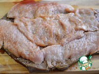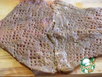 Индюшатину так же отбить и выложить на говядину, таким образом, чтобы была заполнена вся площадь мяса. |