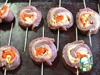Свернуть рулетом и проколоть шпажками как на фото. |