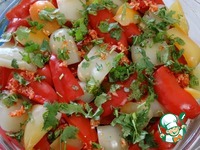 Затем слой нарезанных на дольки помидоров, зелень и перечно-чесночную смесь. |