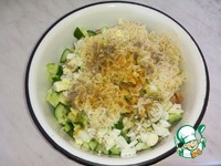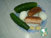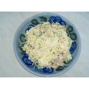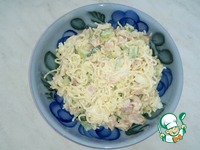 Нарезаем яйца, огурцы, колбасу, мелко измельчаем чеснок. Сливаем воду с вермишели, всё смешиваем. |