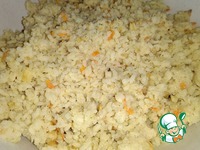 В плов добавить яйца, сыр, резанную зелень и хорошо смешать. Если в плове есть мясо-его следует измельчить и добавить туда же. Если мало соли, то следует присолить. Вот такой рисовый фарш получается. |