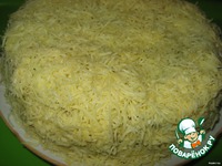 Бока торта смазать майонезом, обсыпать все натертым сыром. |