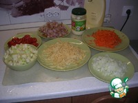 Кабачок, лук, курицу нарезать кубиками. Морковь и сыр натереть на крупной терке. Помидоры нарезать кружочками. |
