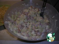 Кабачок, курицу и лук перемешать с 2-мя столовыми ложками майонеза. |