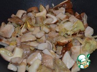 Грибы слить от жидкости, промыть. Выложить к луку и обжарить на сильном огне, 5 минут, помешивая. |