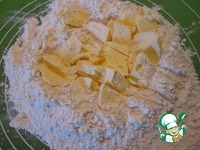 Сначала необходимо приготовить тесто. Для этого нужно просеять муку на рабочую поверхность и добавить порезанное на кусочки охлажденное сливочное масло. |