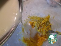 Растереть желтки с мукой и тонкой струйкой влить молочную смесь, все время мешая, чтобы не было комочков. |