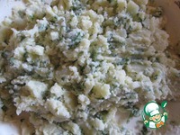 Зеленый лук нарезать колечками, петрушку порезать мелко, смешать с мякотью картофеля, посолить, поперчить, добавить сметану ( или майонез ), перемешать. |