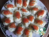 У картофеля срезать выступающую часть клубня, чтобы хорошо стоял на тарелке, слегка посолить. В углубление выложить начинку из мякоти со сметаной и зеленью, сверху украсить красной икрой. |