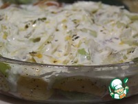 Йогурт смешать с тертым кабачком, добавить соль, сахар, перец - откорректировать по своему вкусу. Распределить йогуртовую заливку сверху, особенно хорошо смазав рыбные ряды. |