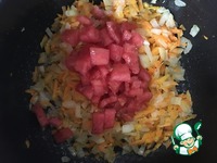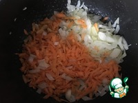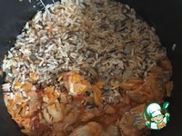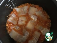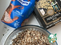 Теперь нам необходимо уже сваренные крупы добавить к овощам с рыбой. Я часто готовлю эту кашу и уже на глаз знаю, сколько необходимо воды для того или иного количества каши. Аккуратно лопаткой, чтоб не разломать филе, отодвиньте рыбу в одну сторону сковороды, а в другой, где бульон- выложите кашу. Так удобнее будет томить и после выкладывать в сервировочное блюдо. Хочу обратить ваше внимание, чтоб потом не было лишних вопросов- воды должно быть не много и не мало, каша не должна быть жидкой, как суп, но и рассыпчатой тоже быть не должна. После того, как вы добавите кашу к рыбе, все это чуть потомится, крупа немного впитает в себя бульон, каша в итоге должна быть с небольшим количеством бульона, совсем немного, в этом суть. Поэтому учитывайте количество воды, когда заливаете рыбу и конечно пробуйте на соль, если нужно досаливайте |
