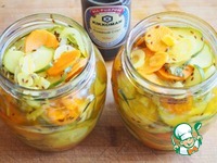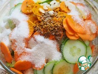 Соединить в огнеупорной форме огурцы, морковь, лук. Добавить к ним воду, уксус, соль, сахар, семена укропа, куркуму и мелко нарезанный чеснок. Перемешать. |