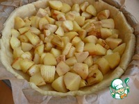 Тесто на пекарской бумаге поместить в форму и равномерно распределить по ней. На тесто выложить яблоки. |