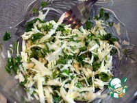 Смешиваем 50 г натертого сыра и нарезанную зелень. |