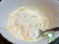 Для соуса смешиваем сметану, оставшийся натертый сыр и нарезанный чеснок. |