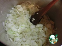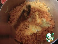 Выкладываем в кастрюлю к луку морковь, натертую на терке, немного ее тушим - 3-5 минут. |