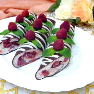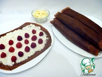 Пока рис остывает, приготовьте блинчики. В небольшой кастрюльке подогрейте молоко. В горячем молоке растопите шоколад. Яйца взбейте с солью (щепотка) и сахаром, не останавливая работу миксера, влейте горячее шоколадное молоко. В шоколадно-молочную смесь влейте минеральную воду, всыпьте муку с какао-порошком, замесите блинное тесто. Дайте тесту постоять минут 30 при комнатной температуре, добавьте в блинное тесто 3-4 ст. л. растительного масла. Напеките тонкие блинчики. Из данного количества продуктов получилось 10-12 блинчиков (d 24 см.) |