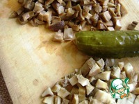 Нашинковать грузди средними кубиками. Так же нашинковать и соленые грибы, отжав их от рассола. |