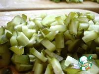 Нашинковать огурцы кубиками - свежий помельче соленого. |