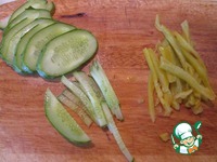 С хорошо пропотевшего перчика снять кожу, удалить семена и нарезать полосками 0,5 см. Выделившийся сок оставить для заправки. Огурец нарезать наискосок тонкими пластинками, затем полосками 0,5 см. |