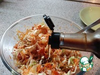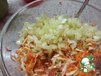 В миску выложить капусту и смесь из натёртых овощей: редиса и моркови. Перемешать |