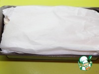 Продолговатую форму выстелить бумагой для выпечки, с припуском на прикрывание хлеба сверху. Выложить мясную начинку |