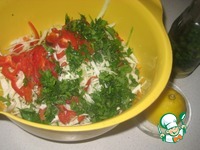 В миске соединить все овощи, добавить мелко нарезанную кинзу и петрушку. Влить лимонный сок и ароматное масло, добавить соль и смесь перцев по вкусу, хорошо перемешать. |
