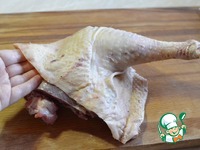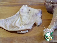 В моем случае я снимаю кожу с огромной ножки индейки. Также замечательно будет снять кожу с небольшого цыпленка. |