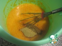 Добавляем растительное масло и тыквенное пюре, перемешиваем. |