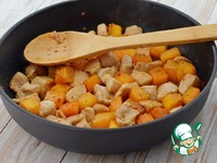 К готовой курице добавить кусочки тыквы, аккуратно перемешать, попробовать на вкус и, если нужно, добавить соус соевый и, может быть, и меда. |