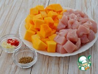 Тыкву и филе курицы нарезать кубиком 1,5 -2 см, чеснок мелко порубить, перец порезать, семена у перца удалить, зиру и кориандр потолочь в ступке. |