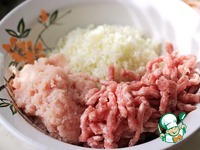 В миску сложить мясной фарш, измельченные куриное филе и капусту. |