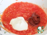 Приготовить соус: помидоры разрезать на половинки и натереть на крупной терке (шкурки выбросить), добавить ложку томатной пасты, пару ложек сметаны, приправы и хорошо размешать. |