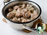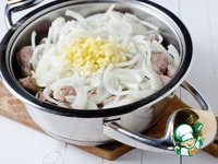 Затем перевернуть мясо на другую сторону, оставить на несколько минут, после чего добавить нарезанный полукольцами лук, очищенный, мелко нарезанный имбирь, мед и уксус. |