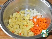 Овощи моем, чистим, кубиками режем лук, морковь и картофель. |