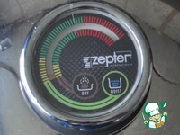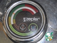 Медленно доводим стрелку термоконтроллера на крышке до начала зелёной зоны. Убираем огонь до минимального - 1-е деление из 6. |