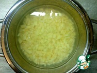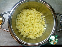 Картофель нарезать мелкими кубиками. Сложить в кастрюлю Zepter. Добавить очищенный зубчик чеснока. |