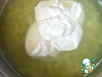 Как только картофель будет готов, выловить и выкинуть зубчик чеснока, добавить сметану с мукой, тщательно перемешать. |