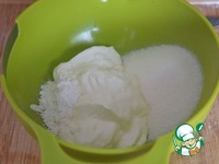 В большую миску положить сметану и влить сливочное масло. Перемешать массу до однородности. |