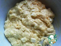 Вмешать в тесто сыры и добавить муку. Замесить тесто, стараясь не поломать кубики. |