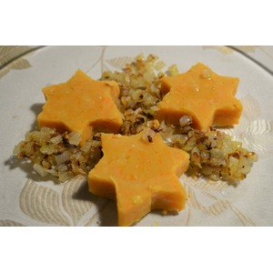 Вырезаем из гороховой каши различные фигурки (можно ограничиться просто ромбами и квадратами), выкладываем на тарелку вместе с жаренным луком. Поливаем горох маслом. Приятного аппетита! |