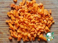 Тем временем морковь почистить, помыть и нарезать кубиками. Открываем духовку, выкладываем морковь к баклажанам, перемешиваем и снова закрываем духовку. |