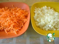 Лук и морковь чистим. Морковь натираем на крупной терке, а лук нарезаем кубиками. |
