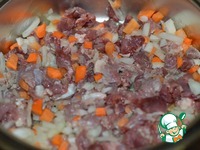 Все овощи почистить. Мясо, лук и морковь на резать мелким кубиком. |
