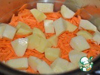 Картофель почистить, нарезать кубиком, выложить на морковь. |