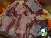 Мясо выложить поверх овощей. |