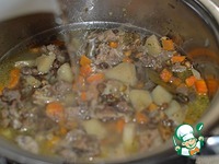 Затем снять крышку, влить немного горячей воды, регулируя густоту супа, дождаться пока суп начнет закипать, накрыть кастрюлю крышкой и снять с огня. Оставить на 20 минут. |