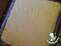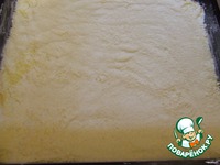 Противень мы должны смазать маргарином. Тесто нужно разделить на две части. Одну часть мы должны выложить на противень. |