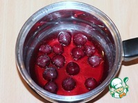 3. Приготовим ингредиенты для соуса. В небольшой сотейник выложить вишню, косточку удаляете. Добавляете вино, сахар и корицу. |