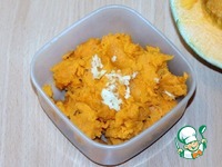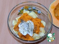 3. В горячий картофель выложить тыкву, 2 ст. л. сметаны и приправу, пюрировать массу. |